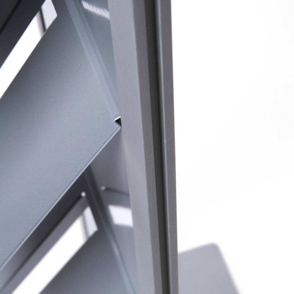 - Diseño elegante: perfiles con borde de aluminio plateado con un panel central con recubrimiento de pintura en gris o negro y base gris.