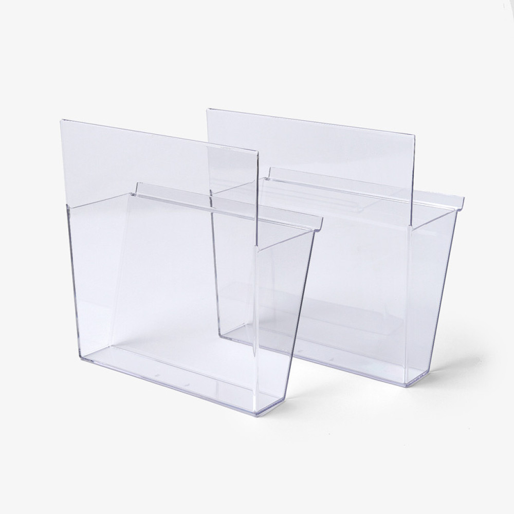 Juego de dos cajetines portafolletos de metacrilato transparente en formato A4.