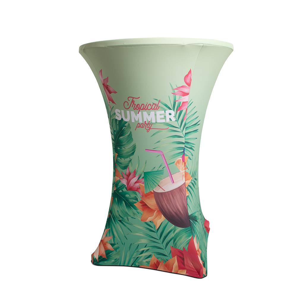 El mantel personalizado para mesa de pie redonda es la solución perfecta para lograr una presentación profesional y elegante en eventos, ferias, exposiciones y celebraciones corporativas. Diseñado para mesas altas de 80 y 90 cm de diámetro, se adapta con un ajuste ceñido gracias a su tela de doble elasticidad antiarrugas.