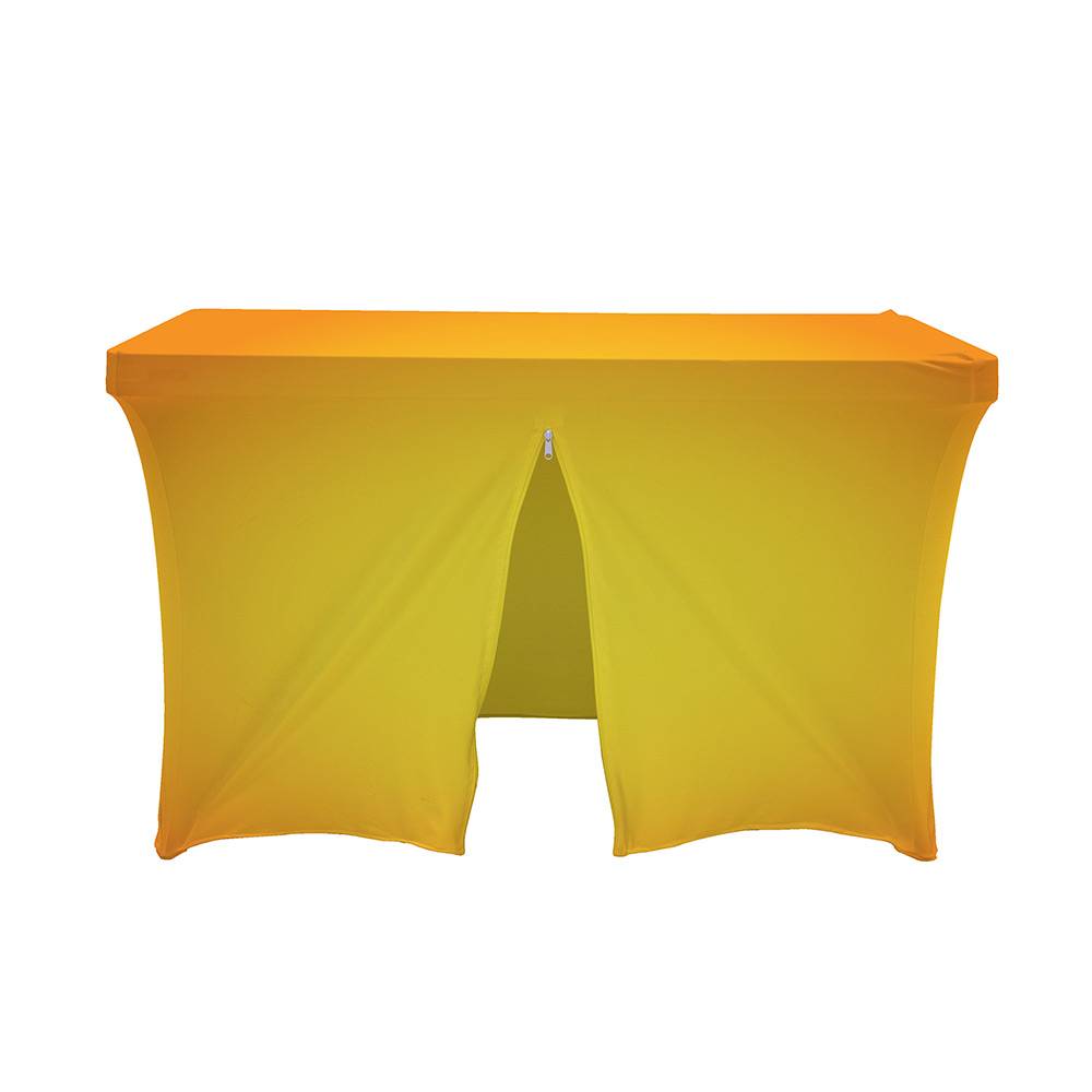 Guarde sus folletos, bolsos o objetos a distribuir debajo de la mesa y cierre el espacio con una cremallera en la parte posterior. Fácil acceso a su espacio de almacenamiento subiendo la cremallera y un look profesional y ajustado. Perfecto para usar en ferias y eventos.