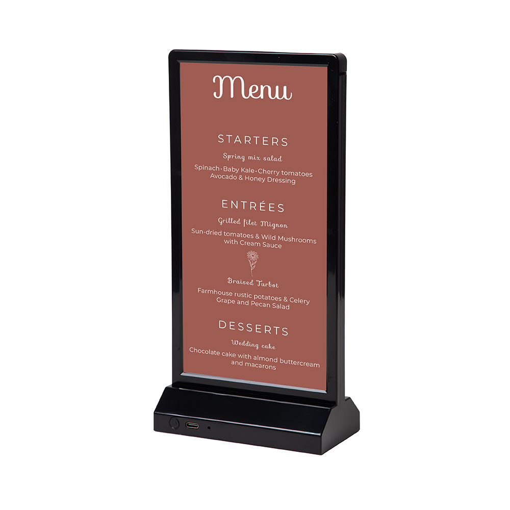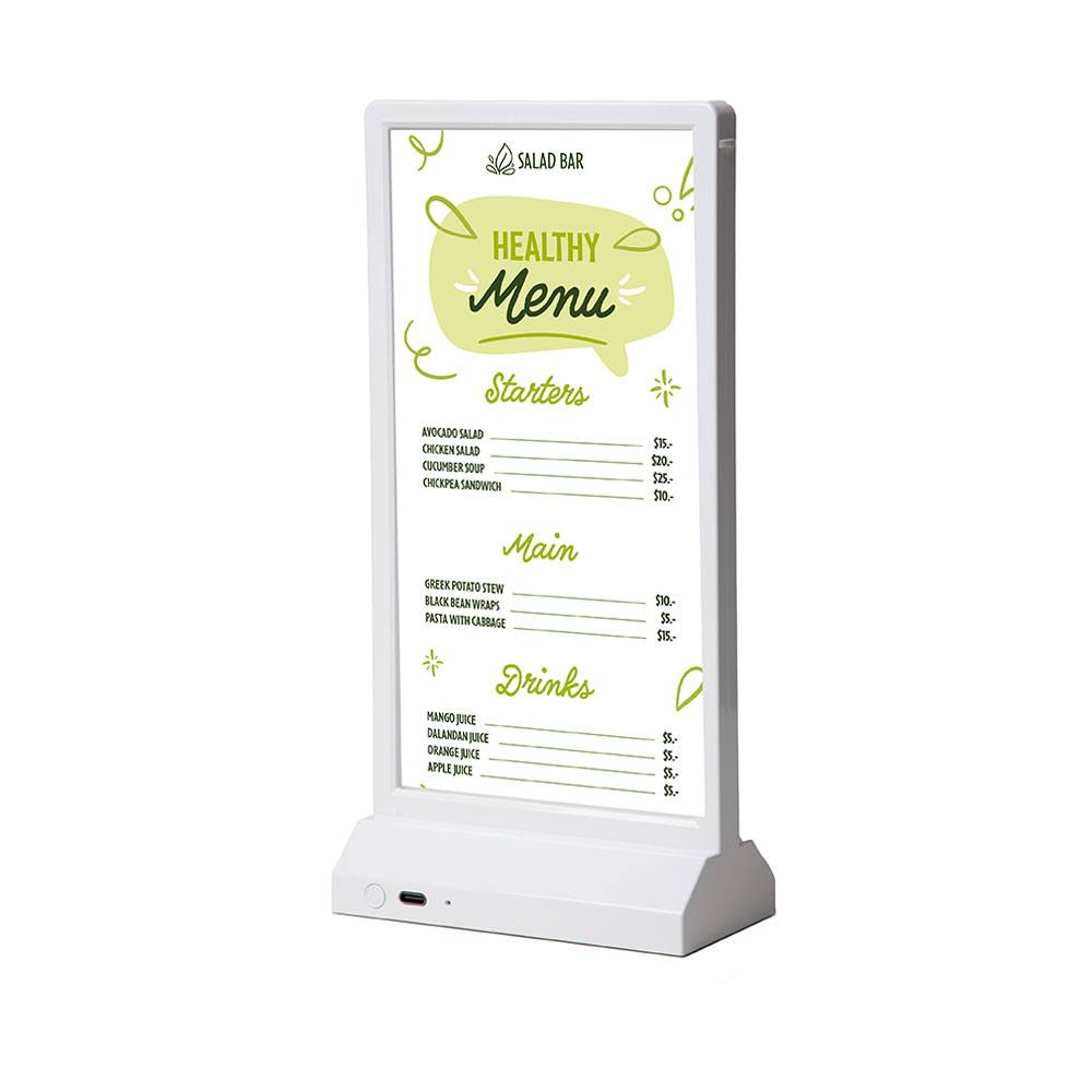 Gracias a su batería recargable, ofrece entre 8 y 10 horas de autonomía con una sola carga, lo que lo hace ideal para eventos de todo el día. Incorpora puerto de carga USB-C en la base y se carga completamente en aproximadamente 2,5 horas, de forma rápida y sencilla. Su marco ultrafino de 12,5 mm aporta un diseño moderno y discreto que centra toda la atención en el contenido.
